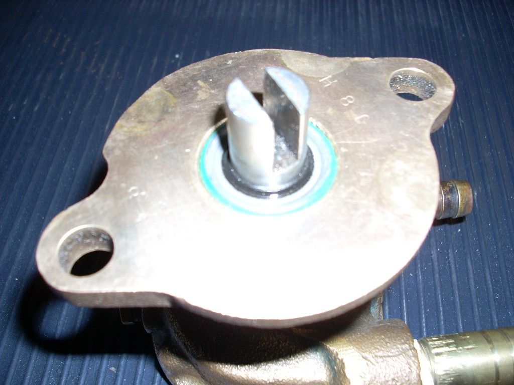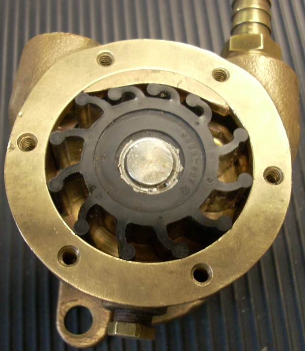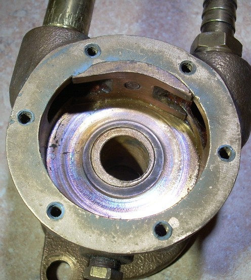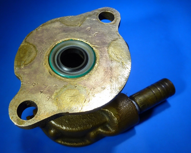 The pump can be rebuilt for about $45 worth of parts: a graphite bushing and two oil seals. The graphite bushing, referred to as a "carbon" bushing in the original documentation, is available through eBay and other web destinations under Sherwood part #11519. The bushing is 0.875 inch O.D., 0.625 inch I.D., and 1.250 inches long.