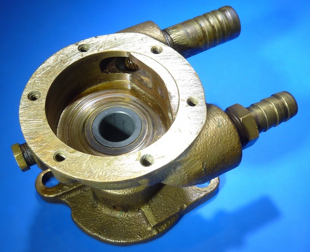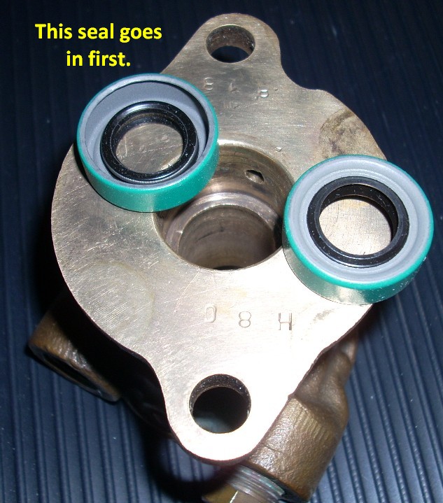 The oil seals are 1.124" O.D. and 0.625" I.D. They are easily obtainable at Bearing Specialties, Kaman Bearings, and any similar bearing suppliers in the USA and elsewhere. Depth doesn't matter provided there is space between the two seals to allow water to drip out the weep hole. The part number I used is "C/R 6229" which is a double-lip seal. (The original 5411 documentation shows only one oil seal.) Press the inner seal all the way into the bore against the seat. I use a 13/16 inch deep socket as a press tool. Orient the seal so its metal side is inward toward the impeller.